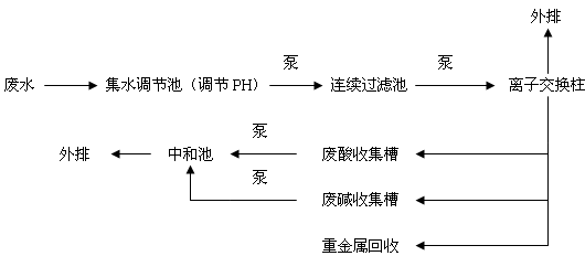 废水处理厂设计书 1废水的水质和水量 处理水量 700m3/d=29m3/h SS(200mg/l) 处理前金属离子浓度 mg/l Ni2+ 220 Cu2+ 80 Co2+ 20 Pb2+ 10 Zn2+ 20 Fe3+ 10 Cl-1500 SO42-1000 PH=2.5 处理后金属离子浓度 (mg/l) Ni2+ 1.0 Cu2+ 1.0 Co2+ 1.0 Pb2+ 1.0 Zn2+ 1.0 PH=6.5~8.5 废水中各种重金属的回收率 Ni的回收率=(220-1)/220=99.5℅ Cu的回收率=(80-1)/80=98.8℅ 2工艺流程方案 工艺流程介绍如图所示 重金属废水通过管道进入集水调节池,投加一定的NaOH溶液以调节PH到中性并进行水量调节,出水经水泵进入连续过滤池以去除水中固体悬浮物,过滤后,经提升泵导入离子交换柱内,在离子交换柱内,重金属离子与弱酸性Na离子树脂发生离子交换反应,重金属即被固定到离子交换树脂上,直到离子交换树脂达到饱和为止。此时排出的一部分水用于淋洗再生后的树脂,其他水外排。接着进行树脂的反洗,再生。树脂再生后的洗脱液浓集了大量有毒而又有用的重金属离子,将再生洗脱液导入废酸收集槽内,接着进行树脂的转型,将转型后的废碱液导入废碱收集槽内,再用水泵将废酸和废碱同时导入中和池内,最后重金属经回收处理。 |