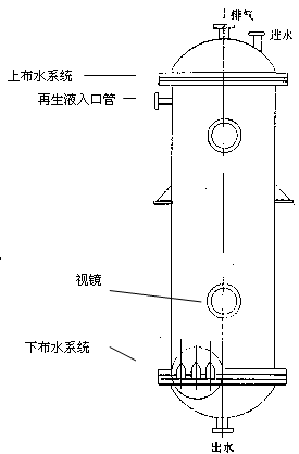 3.3离子交换柱设计计算 离子交换是靠交换剂自身所带的能自由移动的离子与被处理的溶液中的离子通过离子扩散来实现的,推动离子交换的动力是离子间的浓度差和交换剂上的动能基对离子的亲合能力,这就是离子交换的基本原理。 针对Ni2+,Cu2+,Co2+,Fe3+等离子。采用弱酸氢离子交换树脂。这种树脂对氢离子选择能力特别强,对多价离子的选择能力也忧于低价离子。弱酸性阳离子交换树脂指含有羧酸基(—COOH),磷酸基(—PO3H2)等的离子交换树脂,其中以含有羧酸基的弱酸性树脂用途最广,含羧酸基的阳离子交换树脂在水中的解离程度较弱,在10-5~10-7之间,所以显弱酸性,其解离如下: R—COOH←→R—COO-+H+ 它仅能在接近中性和碱性介质中才能解离而显示离子交换能力,含羧酸基的弱酸性离子树脂是用甲基丙烯酸或丙烯酸与二乙烯苯进行悬浮共聚而后水解的方法制得,过去,聚丙烯酸系弱酸性树脂以对链霉素的特殊选择交换吸附性能而主要用于链霉素的分离提炼。近年来,根据它的高达9mg 当量/g左右的交换容量,容易再生,以及对二价金属离子具有较好的选择性的特点,已广泛用于水处理及工业废水处理等方面。 再生阶段的液流方向和交换时水流方向相同称为顺流再生,反之称为逆流再生。顺流再生的优点是:设备简单,操作简单,工作可靠。故在本设计中采用顺流再生固定床工艺。 离子交换柱设计计算公式 (1)计算交换柱处理负荷 G=Q(C—Cp) G—处理负荷 mol/h Q—处理水量 m3/h C—进水浓度 mol/m3 Cp—出水浓度 mol/m3 (2)计算所需树脂的总体积 ▽=GT/EO ▽=树脂总体积 m3 T=树脂再生周期 h EO=工作交换容量 mol/m3 (3)设计离子交换柱的直径 D=√(4Q/πV) D—离子交换柱直径 m V—处理液在柱内流速 m/h (4)计算离子交换柱高度 h=4▽/(D2π) h—树脂层高度 m H—离子交换柱高度 m H=h(1+α) α—树脂清洗时膨胀率 可按40%-50%考虑 (5)离子交换再生液的计算 再生剂的用量 M=q0E0▽ M—再生剂的用量 g Q0—再生剂耗量 g/mol ▽—饱和树脂的体积 m3 再生液的体积 ▽I=M/Ci ▽I—在一定浓度下的再生液的体积 L Ci—再生液中所含再生剂的浓度 g/l 整个处理过程发生的化学反应(Na型阳离子交换柱) 去除 2R—COONa+M2+←→(R—COO)2M+2Na+ 式中 M2=Ni2+,Cu2+,Zn2+,Pb2+,Co2+等 再生 (R—COO)2M+2HCl←→2R—COOH+MCl2 转型 R—COOH+NaOH←→R—COONa+H2O 3.3.1采用弱酸双阳柱全饱和流程 离子交换柱应去除的金属离子的物质的量,考虑到出水中金属离子的含量比较少(Cp≈0) Ni2+(220mg/L)物质的量浓度为C (1/2Ni2+)=7.48mmol/L Cu2+ (80mg/L)物质的量浓度为C (1/2Cu2+)=2.52mmol/L Co2+ (20mg/L)物质的量浓度为C (1/2Co2+)=0.59mmol/L Fe3+ (10mg/L) 物质的量浓度为C (1/3Fe3+)=0.19mmol/L Pb2+ (10mg/L)物质的量浓度为C (1/2Pb2+)=.1.035mmol/L Zn2+ (20mg/L) 物质的量浓度为C (1/2Zn2+)=.0.62mmol/L 合计 12.435mmol/L 每日应去除金属离子负荷为 G=Q(C—Cp)=700m3/d×(12.435—0)mmol/L=8704.5mol/d 3.3.2计算Na型阳离子交换树脂交换塔所需树脂的体积,该弱酸阳树脂工作交换容量E0=1500mol/m3,决定树脂再生周期T=2d,所需树脂的体积 ▽=GT/E0=(8704.5mol/d×2d)/1500mol/m3=11.606m3 计算交换塔尺寸 设交换塔直径D=1800mm(1.8m) 则树脂层厚度为 h=4▽/(D2π)=(11.606m3×4)/(π×1.82)=4.6m a— 考虑反冲洗时树脂的膨胀率α=50℅ 所以交换塔高 H=h(1+α)=4.6×(1+50℅)=6.84m 采用2柱串联,则每柱的树脂深度为6.84/2=3.42m 3.3.3计算交换塔阳树脂再生时的耗酸量,查表得HCL的再生剂耗量为 q0=50g/mol M=q0E0▽=50g/mol×1500mol/m3×11.606m3=870450g 表见标注1 如配成5%浓度的盐酸,查表得每升含盐酸质量51.2g,即浓度Chcl=51.2g/L.故所需5%的盐酸再生液体积: ▽HCL=M/CHCL=870450g/(51.2g/l)=17000L 再生周期为12h。 3.3.4计算转型液用量 转型液用量为树脂体积的1.5倍即11.606×1.5=17.409m3 取转型液(NaOH)浓度(4℅)转型 即为1mol/L(NaOH的密度约等于水的密度) 转型周期为12h 3.3.5新树脂的预处理 弱酸阳树脂再生淋洗宜用低纯水,水量约为树脂体积的6倍,淋洗流速先用再(0.4m/h),后逐步增大到交换流速(10m/h).、 预处理用水量=11.606×6=69.636m3 转型淋洗要用低纯水,大量约为树脂体积的6倍,淋洗到出水PH=8—9,淋洗开始用再生流速,然后用交换滤速淋洗。 淋洗用水量=11.606×6=69.636m3 3.3.6离子交换柱尺寸设计 离子交换柱简图如右图所示再生液入口管离子交换柱管径的确定 根据公式 d=18.8(Q/v)1/2 d—管内径(mm) Q—介质容积流量(m3/h) v—介质平均流速(m/s) 因废水中含有重金属离子和氯离子,硫酸根离子 查表得 盐水的滤速通常为1.0~2.0m/s 取v1=1.0m/s 则进出水管直径 视镜滤速表见标注2 根据经验 排气口管直径比进水管小1~2号即排气管的直径为90mm. 因再生需要12个小时,且在12个小时的总流量为17m3+69.636m3=86.636m3考虑到多用的水量取V总=90m3 d=18.8(Q/v)1/2 查表得盐酸的常用流速v2=1.5 m/s Q总=90/12=7.5m3/h d2=18.8(7.5/1.5)1/2=42mm 取40mm 转型所需时间为12小时,且在12个小时的总流量为 17.409m3+69.363m3=86.772m3考虑到多用的水量取V总=90m3 d=18.8(Q/v)1/2 查表得NaOH的常用流速v3 =2.0m/s Q总=90/12=7.5m3/h d3=18.8(7.5/2)1/.2=36mm 取40mm 滤速表见标注2 3.3.7 离子交换柱壳体壁厚设计计算 壳体的空间高度除交换树脂层,压脂层占有的高度,还应能满足树脂层所必需的反洗膨胀高度,此高度一般应为树脂层于压脂层高度的50-60℅。 壳体材料应满足交换柱强度及耐柱内工作液腐蚀的要求。在本设计中,采用碳素钢及低合金钢。 壳体的附件有,上进水管,下出水管,排气管,视镜等,视镜