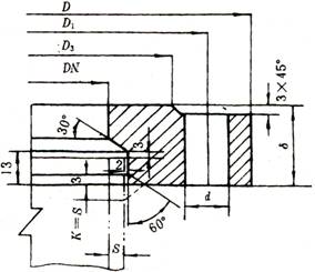 3.3.8离子交换柱封头设计 采用标准椭圆形封头,封头用碳素钢材料制成 标准椭圆形封头壁厚计算公式 δ=PDi/(2[σ]tφ-0.5P)+C1+C2 已知 P=1MPa Di=1800mm [σ]t=170MPa φ=1(整体冲压) Ci=0.6mm(钢板负偏差) C2=1mm(单向腐蚀) δ=(1×1800)/(2×170×1-0.5×1)+1=6mm 当碳素钢封头厚度在4~8mm,封头直边h高度取25mm 3.3.9离子交换柱的支座设计 采用支承式支座 用钢板组焊接的支承式支座已经标准化,通过查表得 Di=1800mm时,支座的主体负荷为2.5T 支座的支承面积为444cm2 支承面上的单位压力为5.6×10-1MPa 支座尺寸L=290mm H=350mm a=180mm b=215mm c=250mm e=90mm s=16mm 地脚螺栓尺寸孔径d=30mm 直径M24 每个支座质量23.4kg 采用三个支座 支座规格表见标注3 3.3.10离子交换柱的开孔及补强,凸缘设计。 当筒体内径Di﹥1500mm时,开孔最大直径d≦Di/3 且d≦1000mm 接入再生液进口管时,S封=4mm d排=40mm 查表得开孔规格 外径D=160mm 内径d=80mm 转型液进口管和淋洗水进口管管径均为40mm S封=6mm 查表得开孔规格 外径D=160mm 内径d=80mm 接入排气管时 S封=6mm d排=90mm 查表得开孔规格 外径D=180mm 内径d=93mm 接入进水管时 S封=6mm d进=100mm 查表得开孔规格 外径D=200mm 内径d=112mm 开孔规格表见标注4 以上开孔后均采用凸缘代替接管,凸缘本身具有加强开孔的作用,不需要另行补强缺点是螺栓断在螺栓孔中后,取出较困难。凸缘与管道法兰配用,因此其连接尺寸应根据所选用的管法兰确定。 3.3.11离子交换柱法兰联接设计 法兰联接是由一对法兰,若干螺栓螺母和一个垫片组成法兰技术发展至今,已有一套法兰标准规格。 对于离子交换柱筒体其公称直径Di=1800mm 采用甲型平焊法兰,平面型密封面,法兰的各部分尺寸查表得知: 法兰尺寸表见标注5 法兰的标准号为JB1158—82 法兰尺寸 D=1930㎜,D1=1890㎜,D2=1855㎜,D3=1841㎜,D4=1838㎜, δ=56㎜,d=23㎜, 螺栓规格:M20 数量52,垫片材料选用石棉橡胶板,螺栓材料选用Q235-A, 螺母材料选用Q215-A。 法兰尺寸示意图规格如右图: 对于离子交换柱的管道法兰,如下表: PN0.6MPa凸面板式平焊钢制管法兰(GB9119.6 -88)㎜