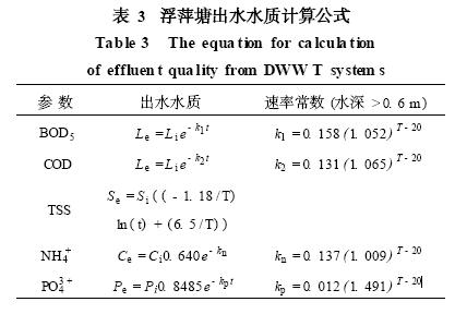 3. 2 浮萍处理系统的污染物去除机理及设计参数 浮萍垫层的下面根据氧含量的不同形成3 个层:好氧层、兼氧层和厌氧层。3个层中存在对应的好氧、兼氧、厌氧微生物群落。处理系统依靠浮萍和这些微生物共同完成对各项污染物的处理。由于浮萍没有庞大的根系,它不能通过根部向水中释放大量的氧气;并且浮萍垫层的形成也阻碍了空气中氧向水中扩散,因此浮萍塘的好氧层通常较浅,在浮萍垫层以下只有约10 cm深。再向下则是兼氧层和厌氧层。由于浮萍根系较小,为微生物提供附着的面积非常小, 塘内的微生物主要是以悬浮状态存在[ 16 ] 。 塘内有机物的降解主要通过微生物来完成。研究发现在塘中尽管好氧菌群可以降解一些有机物,但大部分有机物的降解是靠厌氧微生物群来完成的[ 16, 17 ] ,浮萍塘可耐受的进水最大COD 浓度约为300~500 mg/L。塘中氮的去除主要是通过4个过程完成: (1)浮萍的吸收; (2)随固体颗粒物的沉降;(3)微生物硝化作用和反硝化作用; (4)氨的挥发。磷的去除主要是通过的浮萍的吸收和沉降作用[ 17 ] 。 为了避免温度的分层,塘的水深通常在0. 6~1. 5 m之间。系统通常采用推流式,流速在0. 1 m / s左右。有机物去除率与温度和停留时间有关,处理生活污水时,在热带地区水力停留时间在10~20 d内即可将出水BOD5 降低到30~20 mg/L。浮萍处理系统多在自然条件下运行,其具体的设计及运行参数由于所处地区气候条件的不同而有较大的差别,但大都是以BOD5 和TSS的负荷为主要的设计参数[ 14 ] 。Smith等[ 14 ]曾对热带地区以BOD5 为主要去除目标的浮萍污水处理系统的设计运行进行了总结。他们假定塘中有机物的降解以微生物的厌氧分解过程为主,采用推流式多点进水模式,发现各项污染物的去除效率主要是温度的参数(表3) 。