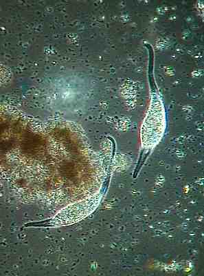 (1) 着生的缘毛目多时,处理效果良好,出水BOD5和浊度低。(如小口钟虫、八钟虫、沟钟虫、褶钟虫、瓶累枝虫、微盘盖虫、独缩虫)这些缘毛目的种类都固定在絮状物上,并随窗之而翻动,其中还夹杂一些爬行的 栖纤虫、游仆虫、尖毛虫、卑气管叶虫等,这说明优质而成熟的活性污泥。 (2) 小口钟虫在生活污水和工业废水处理很好时往往就是优势菌种。 (3) 如果大量鞭毛虫出现,而着生的缘毛目很少时,表明净化作用较差。 (4) 大量的自由游泳的纤毛虫出现,指示净化作用不太好,出水浊度上升。 (5) 如出现主要有柄纤毛虫,如钟虫、累枝虫、盖虫、轮虫、寡毛类时,则水质澄清良好,出水清澈透明,酚类去除率在90%以上。 (6) 根足虫的大量出现,往往是污泥中毒的表现。 (7) 如在生活污水处理中,累枝虫的大量出现,则是污泥膨胀、解絮的征兆。 (8) 而在印染废水中,累枝虫则作为污泥正常或改善的指示生物。 (9) 在石油废水处理中钟虫出现是理想的效果。 (10) 过量的轮虫出现,则是污泥要膨胀的预兆。 另在一些对原生动物不宜生长的污泥中,主要看菌胶团的大小用数量来判断处理效果。 相关微生物的图片提供如下: 1、变形虫(阿米巴)amoeba. 顾名思义,变形虫是能变形的。不过这种变形也是有限度的。
