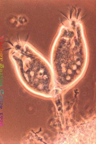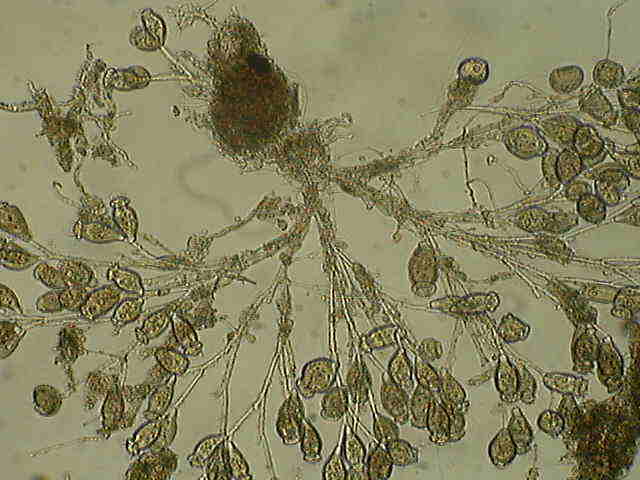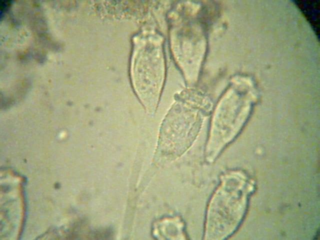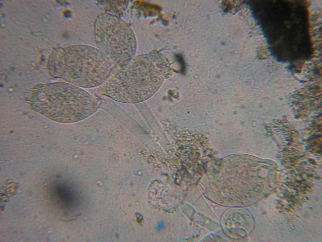 上面这张是生物接触氧化池填料上的微生物,应该是累枝虫吧!也有点象钟虫。下面这张也是:
