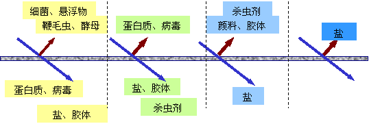 这些分离膜的“孔径”和分离的对象如下表和下图所示: