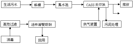 经过格栅处理将大块污物截留后进入集水池,在此进行水质和水量的调节,然后进入S-BF高效反应装置,该装置是一种具有新型生物填料的生物反应装置,它具有负荷高、占地小、处理效果稳定可*和造价低的特点,并已获得国家专利。其出水再经高效沉淀后排放或进一步进行回用处理。 回用处理采用“高效过滤”、“活性凝聚吸附”和“次氯酸钠消毒”手段来完成,具体介绍如下: (1)高效过滤罐: 该装置主要用于去除出水中较细小的固体颗粒和其它悬浮在水中的微小杂质。本工艺采用新型的高效滤料,此滤料由多种介质混合加工而成,具有强度高、过滤流速高、反冲洗方便和效果稳定可*等特点,从而使其对进水的过滤净化功能大大增强,提高了出水的水质状况。 (2)活性凝聚吸附罐: 吸附法常用来去除水中的有机物、胶体物质、微生物等。而活性炭是目前水处理中最为常用的吸附剂,其处理效果好、占地面积小、管理方便、又可再生。同时,对某些金属及其化合物也有很强的吸附能力。本装置并非单纯的采用活性炭吸附,而是将活性炭进行了一种特殊处理,加大了活性炭的吸附容量,从而加强了活性炭的吸附效果,使出水水质更加提高。 (3)次氯酸钠消毒装置: 为降低成本,有条件的地方可直接购入次氯酸钠对水进行消毒,无条件的地方可采用次氯酸钠装置或其它消毒手段。 处理产生的污泥由污泥浓缩脱水一体机处理成泥饼外运。 3.2 CASS工艺