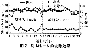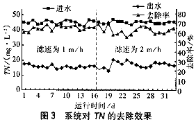 图3系统对TN的去除效果由图3可知,在进水TN负荷为0.28~0.63kg/(m3*d)、滤速为1~2m/h的条件下,曝气生物滤池对TN的去除率可达60%左右,出水TN为12.33~19.46mg/L。提高滤速对TN去除率有一定的影响,其原因可能是提高滤速则相应地增加了曝气量,从而抑制了反硝化细菌的活性。