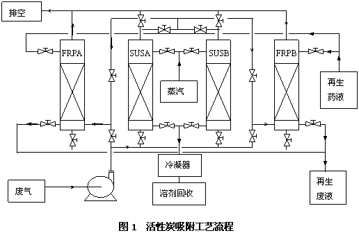 废气由风机逆流先分别通过SUSA和SUSB,然后分别通过FRPA和FRPB,经净化后排出。四个塔分别设有再生接口和管路。市售国产炭和IVP炭采用碱液再生,BPL炭用蒸气再生。
