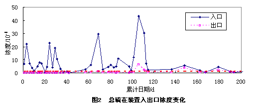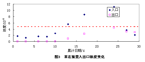 (1)IVP活性炭对恶臭气体吸附适应范围广,吸附量大,在多种组分共存的试验条件下,装置对主要致臭物质硫化物的饱和硫容为116.77 g/L以上,市售国产活性炭饱和硫容可达108.93 g/L。穿透脱臭率可达95.18%;装置对苯系物的穿透脱臭率可达98.9%。从图2和图3可以看出,该工艺在总体上对硫化物及苯系物脱除及效果较理想,能保持出口废气硫化物浓度稳定在较低水平,脱臭效果显著,达到预期目的。