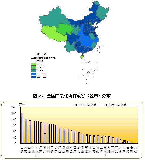 3.2各省(区、市)废气中主要污染物排放情况 1)二氧化硫排放情况 二氧化硫排放量超过100万吨的省(区)依次为山东、河南、山西、河北、内蒙古、江苏、贵州、四川、广东、辽宁和广西,共11个省(区),比上年多2个省(辽宁和广西)。这11个省(区)的二氧化硫排放量占全国排放量的61.4%。工业二氧化硫排放量最大的是山东,占全国工业二氧化硫排放量的7.9%;生活二氧化硫排放量最大的是贵州,占全国生活二氧化硫排放量的18.4%,两个省各自所占比率均比上年略有降低,见图26、图27。