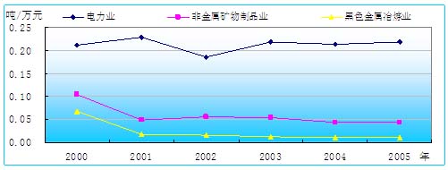 由表19、表20可见,与上年相比,3类行业中非金属矿物制品业二氧化硫污染贡献率略有下降,电力业和黑色金属冶炼业则略有升高;同时,3类行业的经济贡献率均略有下降。 表21 重污染行业二氧化硫排放强度变化趋势 单位:吨/万元