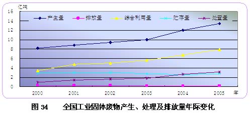 “十五”期间,工业固体废物产生量增长了51.5%,但工业固体废物排放量逐年下降,2005年工业固体废物排放量比2000年下降48.1%,完成了国家“十五”规划指标(2900万吨)。工业固体废物排放量下降的主要原因是工业固体废物处理量(包括综合利用量、贮存量和处置量)的持续增加。与2000年相比,2005年全国工业固体废物综合利用量和处置量分别增加110.7%和241.6%,工业固体废物贮存量减少了10.3%。
