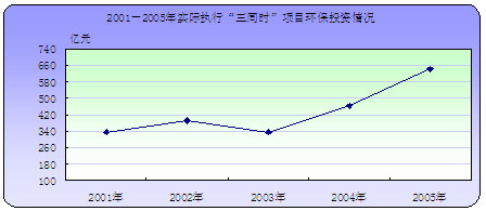 2005年,执行“三同时”项目用于环保工程的实际投资为640.1元,占项目总投资的4.0%,比2004年上升0.1个百分点。其中,新建项目、扩建项目、技改项目环保投资占项目总投资的比重分别为3.6%、5.5%和5.7%,与2004年相比,新建项目的环保投资占项目总投资的比重下降了0.2个百分点,扩建和技改项目的环保投资占项目总投资的比重分别上升0.5、1.9个百分点。
