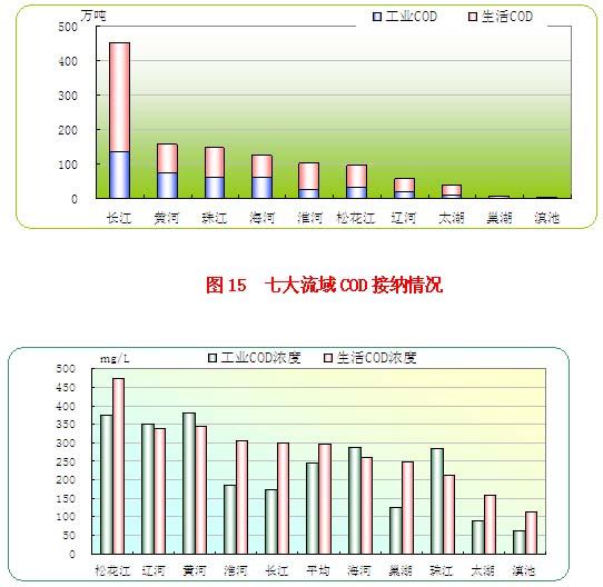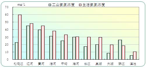 图17和图18说明,除珠江流域外,其他流域生活污水中氨氮排放量及浓度均高于工业废水,尤其是松花江流域,其生活污水中氨氮排放浓度为工业的近3倍,这说明氨氮污染主要来自于生活污水。