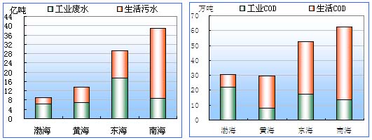 总体而言,四大海域中,南海接纳的废水量、化学需氧量和氨氮最多,东海次之,其中生活污染排放构成南海的主要污染。 2.10渤海接纳废水及主要污染物情况 |