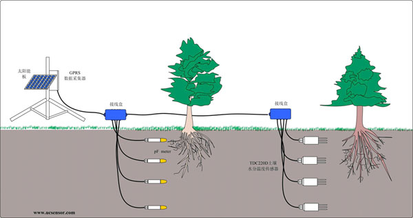 该系统采用SDI-12总线技术,将传感器和数据采集器联系起来,数据采集器有48个通道,可以连接24个PF-METER传感器。
