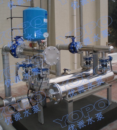 YOPO变频恒压静音管中泵机组无须蓄水池、楼顶水箱等储水设施,也无需水质处理仪器,节省了占地面积,降低投资费用。该设备外观为全不锈钢制造,水泵、电机均选用不锈钢材料,电机和水泵连接后全置于不锈钢管内,无需专门泵房;或竖或卧,可任意放置室内外,无需遮风避雨甚至可置于条件恶劣之水沟、水池内或挂于墙壁上、屋檐下皆可,外观整洁美观,实用大方。当供水设备中的任意一台泵组故障时,只需将此台泵组两端的阀门关闭后即可任意拆装,并不影响其他泵组运行,泵组和电机内的轴承采用水润滑轴承,不需要添加任何油脂,电机选用屏蔽式充水电机,几乎无需维修保养。