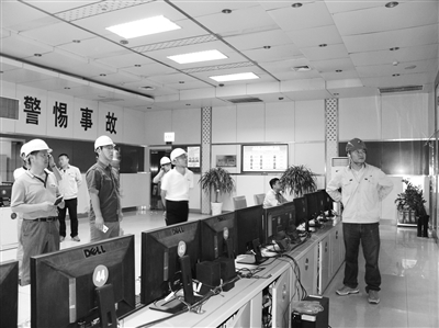 图为参会人员在华电章丘电厂中控室了解超低排放工程污染物排放数据。