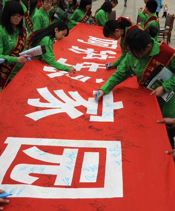 3月22日,省会环保志愿者签名倡导“低碳生活呵护生态家园 ”记者赵永辉摄