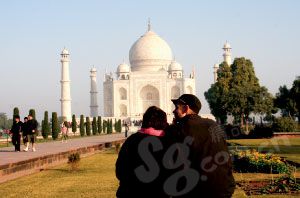 观赏泰姬陵的最佳时间是每天清晨或者黄昏。那个时候,陵墓的白色外墙就像一块无色幕布,将不同色温的光与晕反射。观赏泰姬陵的最佳视角是从远端观景台上平视。近景是百合月季组成的花圃,中景是两排常青林木,一条笔直水带夹在林木中间。端坐于远方高台上的就是那座世间最美的陵墓。她母仪天下,仪态万方。她的静与四周的闹格格不入,她的白与四周的红迥然不同。她就是遗世独立的绝色佳人,倾城倾国都不如她可以让人一见倾心。
