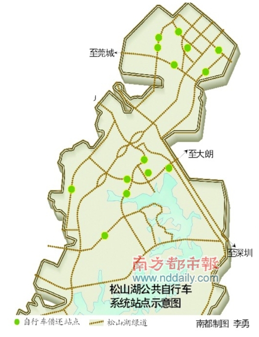 南都记者看到松山湖红棉路等绿道路段,已经竖起公共自行车的标示,路边的柳荫之间有着两米多宽的小道,骑行于其上,可以看到在马路上开车所看不到的湖边风光。
