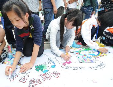 5月16日,广西柳州市一群青少年在长卷上描绘低碳家园。 当日,2010生态柳州低碳科技活动周在广西柳州市金绿洲小区启动。一场以“绿色低碳新生活,山青水秀新柳州”为主题的青少年科普漫画绘画比赛在小区内举办,数十名青少年根据各自对生态低碳家园的丰富想象,以在长卷上绘画的方式传播科学发展新思想,倡导绿色低碳生活方式。