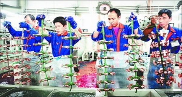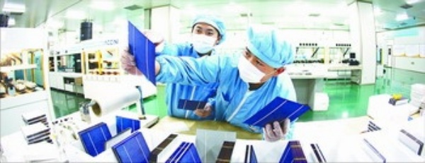 英利集团车间工人在对电池片进行仔细检查。该公司以太阳能光伏产业为核心,是一家拥有从硅料、多晶硅铸锭、切片、电池片、电池组件到光伏系统应用完整产业链的企业。2010年,该公司光伏组件产量将达到1000兆瓦。