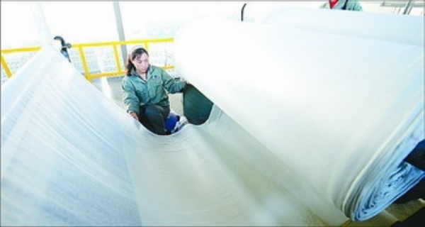 河北昊明人造皮革有限公司生产车间,员工刘桂红在检查产品质量。近年来,该公司不断加大科技投入,大力发展低碳环保产品,已成为我国人造革行业的知名品牌。
