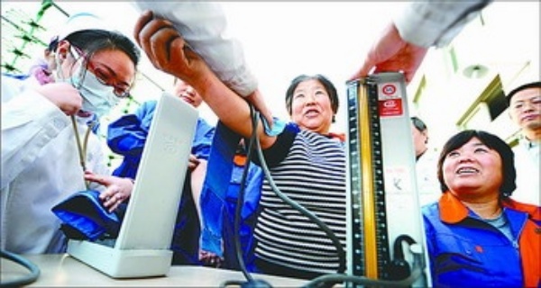 白沟工业园区,医护人员正在为外来务工人员进行免费体检。保定市通过定期组织为外来务工人员送医上门、免费体检诊治等多种形式的公益活动,营造出和谐的社会氛围。