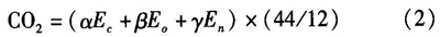 其中,C02为二氧化碳排放量;α、β和γ分别为煤炭、石油和天然气消耗的碳排放转换系数,取EIA、日本能源经济研究所和国家科委的平均值为0.728、0.549和0.416;Ec、Eo和En分别为煤炭、石油、天然气消耗数量;44/12为二氧化碳转换系数。