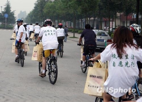 资料图:去年6月21日,四川省眉山市“夏至低碳日”活动正式启动,瑞士驻华大使馆发展参赞沃尔特·梅尔与市民骑自行车上街宣传低碳生活和环保。眉山市政府将每年农历“夏至”确定为低碳日,倡导市民骑自行车上下班,餐住行业取消一次性用品,超市不提供购物塑料袋等活动。2010年6月3日,中国的宁夏银川、四川眉山、山东德州和北京东城区成为中瑞合作低碳城市项目首批试点城市。 中新社发 刘忠俊 摄
