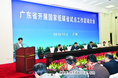 2010年11月2日,广东省政府召开了低碳省试点工作启动大会,汪洋书记出席会议并亲自宣布广东国家低碳省试点工作启动,黄华华省长做了动员讲话和工作部署,朱小丹常务副省长主持会议,省委、省人大、省政府、省政协领导,各地级以上市政府、省有关部门、高校、研究机构、企业主要负责同志参加了会议。低碳省试点工作正式启动在全省上下引起了热烈反响。