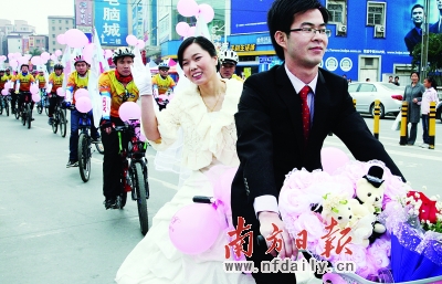 一对新人以单车当婚车来倡导低碳生活理念。南方日报记者 何俊 摄