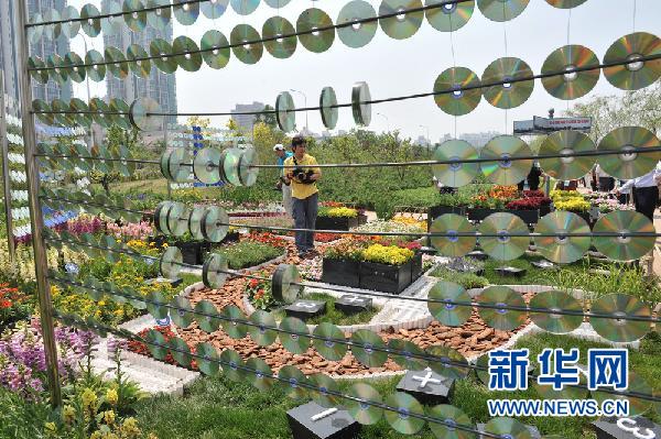 5月28日,在天津水上公园举行的低碳花园展“绿色智慧”展园,利用废弃光盘创作的“算盘”引人注目。新华社发(王德强 摄)