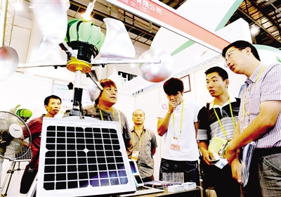 9月8日,在厦门举行的第十五届中国国际投资贸易洽谈会上,低碳、环保的新技术和新产品深受人们的青睐。图为参观者在参观一种新研制的家用风力与太阳能相结合的发电机。新华社记者张国俊摄