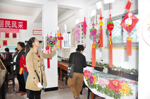 此次手工艺作品比赛,共有100余件作品参赛,并以居民投票的方式决出奖项,得到了社区居民的热烈响应。作品以剪纸、布贴画、十字绣居多。此外,为配合手工艺品展出,居委会工作人员还搜集了书画和摄影作品同时进行展览。社区居民李阿姨用旧布头做出的画作“春、夏、秋、冬”可谓佳作;宋阿姨用旧线头钩制的乌龟抱枕方便实用;巧手居民用尼龙线编织的各种样式的拖鞋和购物袋,简单、时尚又耐用,受到参观居民的一致好评。