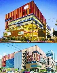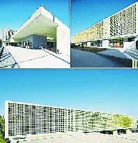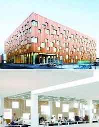该学院共6层,四面均采用遮阳设施,一个3层高的前廊用于防止阳光烤热建筑。