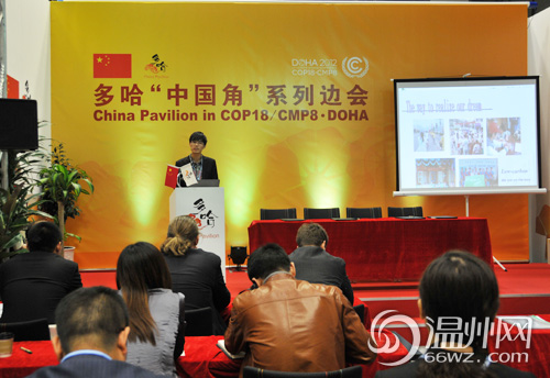 多哈气候大会上,金江和温州市科技局农村与社会发展科技处处长杜晓敏,还有浙江省亚热带作物研究所的研究室主任陈秋夏女士一同带去了温州在应对气候变化的具体实践,如温州低碳小镇项目、小额碳汇认捐公益活动等建设低碳社会的经验和做法,并与各国分享了温州在解决保持经济发展和环境保护矛盾的宝贵经验,将“美丽温州”带到世界舞台上去亮相。