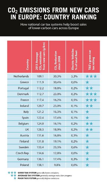 轿车的二氧化碳排放量占到欧洲总体排放的15%,也是交通领域里排放总量最大的单一来源。在“交通与环境”组织的报告里,荷兰、丹麦、法国等国家被列入汽车排放税绿色名单,这些国家的车辆登记制度与车辆购置税制都鼓励消费者选择低碳排放的车型。