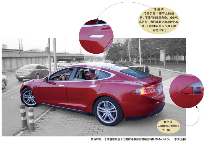 5月的某个傍晚,《环境与生活》记者在紧邻北京中央商务区的通惠河北路,邂逅了一辆造型酷似捷豹和阿斯顿马丁混血儿的红色轿车,它正是特斯拉时下推出的高端纯电动车“Model S”。记者从侧窗看到,这辆车的仪表和中控台几乎没有机械元件和物理按键,取而代之的是电子仪表盘和宽大的中央触控面板。与后车窗等宽的高位刹车灯,在黄昏下格外耀眼。绿灯一亮,它悄无声息地跑出路口,很快钻进晚高峰拥挤的车流中。