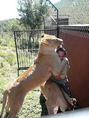 | 胆大的南非"狮子人" 与非洲狮相互拥抱玩耍 |