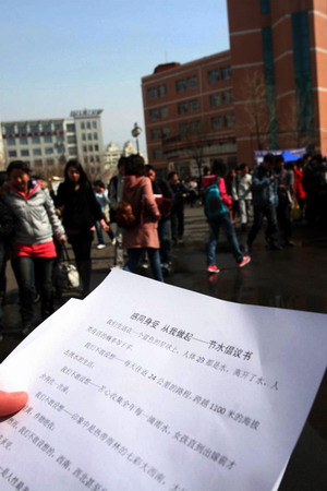 3月29日,志愿者在发放节水倡议书。 当日,黑龙江大学的志愿者在校园里开展节水倡议活动,以发放节水倡议书,开展图片展板宣传的形式号召师生从我做起节约用水,珍惜水资源。新华社记者王松摄