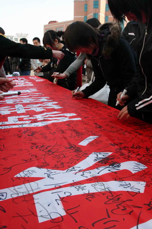 3月29日,大学生在节水倡议活动现场签名。 当日,黑龙江大学的志愿者在校园里开展节水倡议活动,以发放节水倡议书,开展图片展板宣传的形式号召师生从我做起节约用水,珍惜水资源。新华社记者王松摄