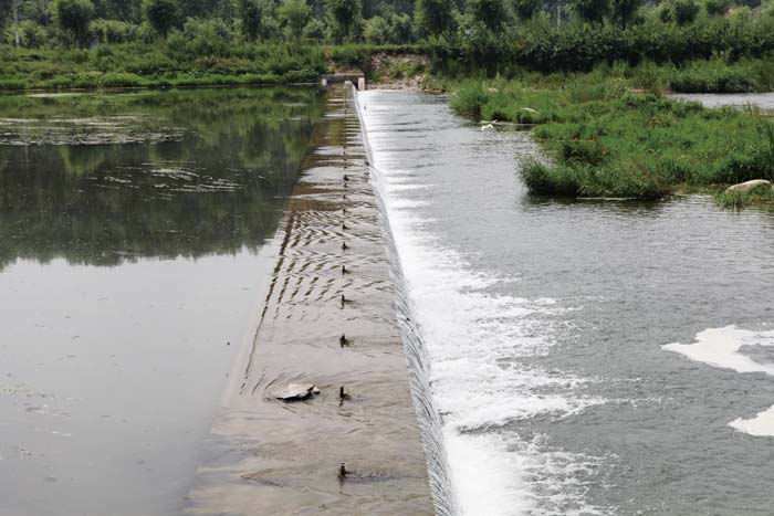 清水河上的滚水坝减缓了水流,白鹭在低空飞翔