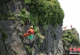 图为环保志愿者下到悬崖下捡拾垃圾。刘忠俊 摄 很多去过峨眉山金顶的游客都记得舍身崖,哪里时常活跃着一些身穿橘红色工作服的蜘蛛侠,他们吊在舍身崖上,捡拾游客扔下的各种垃圾,也被称为崖壁上的舞者。 7月下旬,一群大小环保志愿者们利用假期,来到峨眉山沿山路徒步而行,捡拾路上或者山林中被游客随手丢弃的塑料瓶、自热饭盒、食品包装袋……。在游客和垃圾较多的地方,环保志愿者们还拿出环卫宣传标语悬挂在醒目 [2015/7/30 20:54:17]