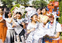今天是“六・五”世界环境日,天津市开展形式多样的环保活动,宣传保护环境、共建美好家园。在河东区香山道小学,老师带着学生们以牛奶盒、塑料袋、易拉罐、糕点包装等百余种生活垃圾为材料,制作出风格各异的“时装”进行表演,在废物利用的同时,宣传今年中国“低碳减排・绿色生活”的环境日主题。(曹彤 刘泽瑞) [2010/6/5 14:18:21]