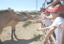 7月31日,几名学生在新疆野马繁殖研究中心给普氏野马喂草料。当日,参加第23届全国青少年科技创新大赛的上百名学生参观新疆野马繁殖研究中心,同时认养编号为准噶尔23号的普氏野马。据了解,以普氏野马准噶尔23号为原型的拟人卡通形象“新新”是第23届全国青少年科技创新大赛吉祥物。 [2008/8/1 8:37:34]