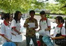 队员们正在学习唱红歌 7月13日,浙江林学院环境科技学院“寻根•助梦”暑期社会实践团来到杭州市青少年活动中心,继续他们的暑期社会实践之旅。 清晨的广场上,多样的老年人晨练运动体现出杭州市民的精神文化生活日益丰富。身着统一的服装,带着印有“大学生暑期社会实践团”的旗帜,实践团一行6人吸引了一些市民的注意,其中一位赵大叔在了解我们的实践意图后,希望可以借此表达自己对国家的感
