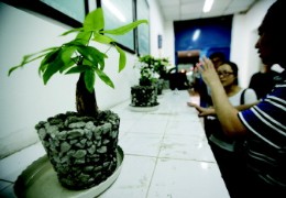 26日,在青岛理工大学土木工程学院教学楼,用混凝土种植的盆栽。本报记者 张晓鹏 摄 齐鲁晚报5月26日讯(记者 李珍梅) 混凝土里也能种绿植?答案是肯定的。不过这种混凝土可不是普通混凝土,而是多孔的生态混凝土。日前,青岛理工大学土木工程学院的学生利用所学专业知识浇筑生态混凝土,并种上绿色植物,可用于河道护坡。 26日,在青岛理工大学土木工程学院教学楼,有几盆特殊的盆景,和一般的盆栽不同,绿色