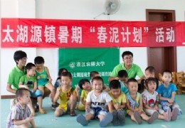 7月11日上午,在与太湖源镇相关负责人取得联系之后,浙江农林大学赴太湖流域生态环境调查团的成员们来到了杨岭幼儿园,与小朋友们共度绿色欢乐时光。 画出自己心中的家园。孩子们异想天开的思维是不可小觑的。他们喜欢拿着画笔随心所欲地在白纸上画出心目中的图案。绿色的地球,在小朋友们的笔下展现出来,树木花草,鸟语花香,有的小朋友不会画鸟,还喊着哥哥姐姐教他们画。天真的笑颜、稚嫩的童语让在场的志愿者们也跟着