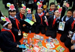 3月5日,小学生在进行义卖活动。 当日,“2011换树1+1,家庭低碳行动”启动仪式在西安市后宰门小学举行,共有1600多名小学生、学生家长和志愿者参加。本次活动现场设立跳蚤市场摊位80个,交易物品包括闲置的服装、图书、文具、玩具、幼儿字画等,所卖款项将全部捐赠给陕西省靖边县金鸡沙一棵树生态小区,用于建造妈妈环保示范林。新华社记者刘潇 摄