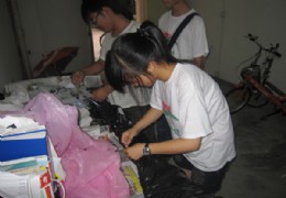 7月18日上午,浙江农林大学信息工程学院“服务新农村建设”暑期社会实践志愿服务团成员们在电脑医院为下午将要开展的“环保低碳”知识宣传活动的进行前期准备工作。 为切合“环保低碳”这个主题,实践志愿服务团队员们从各个寝室回收了各种废纸,一拉罐,塑料袋等废弃物,团队成员们发挥自己的想象设计各式环保时装,并亲手将设计好的服装制作出来。队员们并不擅长制作衣服,但是“坚持不懈,不断创新”的团队精神一直都鼓舞